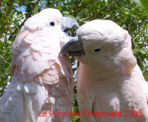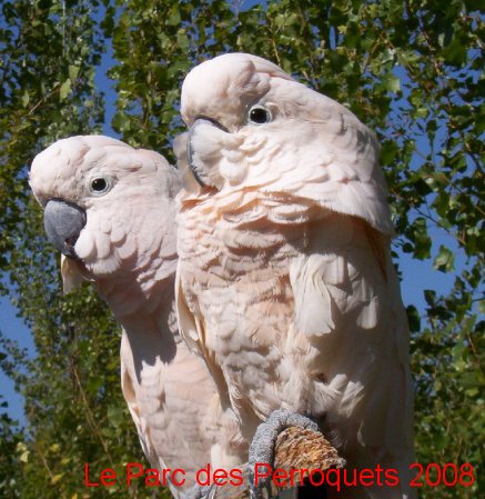 Un de nos couples de perroquets cacatoes des molluques, espèce très rare en élevage et en milieu naturel, la deforestation massive et l'augmentation rapide de la demographie humaine en sont responsables.